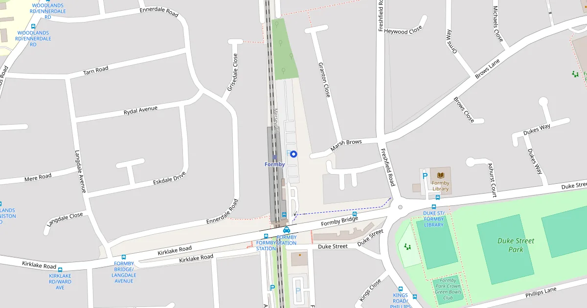 Station car park and park-and-ride at Formby on the Merseyrail Northern line. A practical option if you're heading into Liverpool or Southport by train. The station is a short walk from Formby village centre. Pay and display. Trains run regularly to both Liverpool Central (around 30 minutes) and Southport (around 15 minutes).