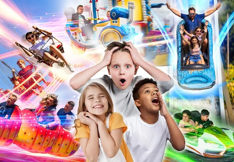 Seaside amusement park with around 100 rides, go-kart track, indoor play area, restaurants and bar.